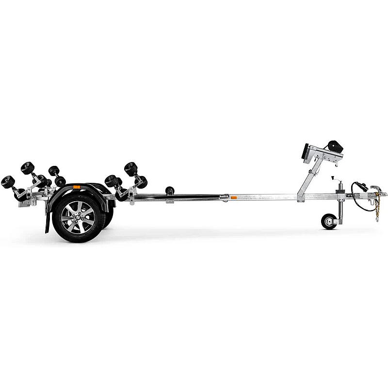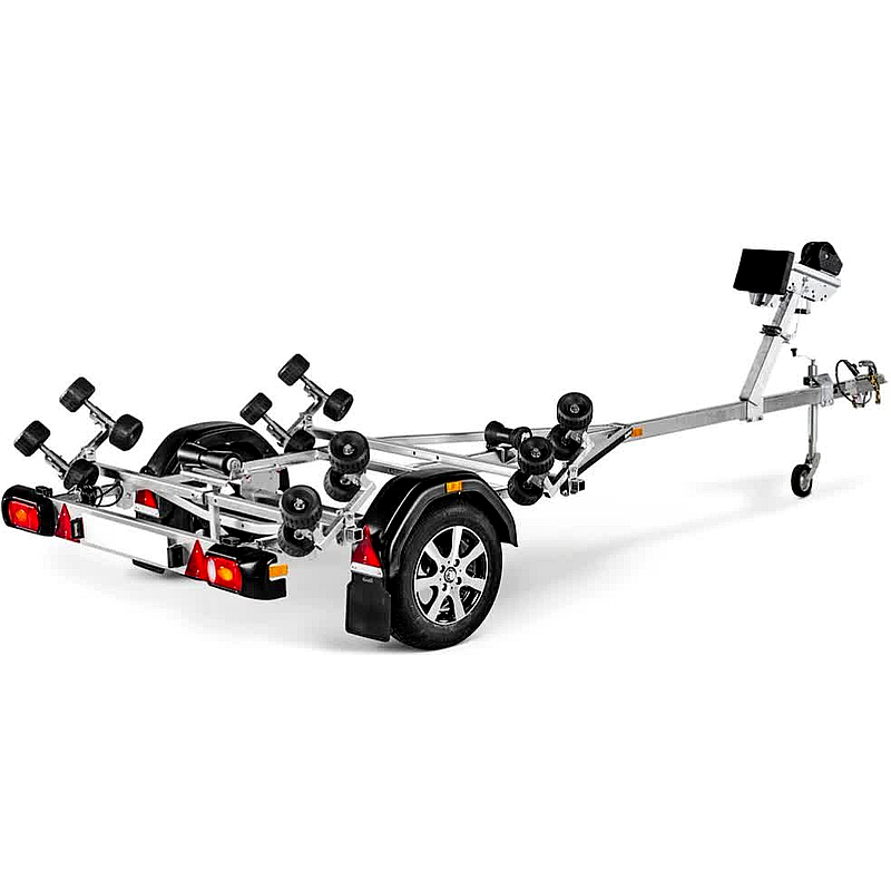 El remolque Brenderup 150600UB es ideal para transportar embarcaciones pequeñas de hasta 15 pies. Diseñado para facilitar la carga y descarga, cuenta con rodillos de quilla ajustables y rodillos laterales dobles que se adaptan perfectamente al casco del barco.