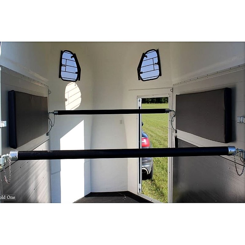 Remolque Gold One para 1 caballo y medio, con dimensiones internas de 315x140x230 cm, peso en vacío de 685 kg y capacidad de carga de hasta 1600 kg. Ideal para el transporte seguro y cómodo de caballos.