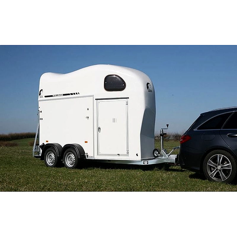 El remolque está equipado con frenos en dos ejes de 900 kg cada uno, proporcionando estabilidad y seguridad incluso en curvas y pendientes. La puerta lateral pivotante con rampa, fabricada en madera finlandesa, es robusta y práctica. Las ruedas de gran tamaño aumentan la durabilidad y la estabilidad durante el viaje. Opcionalmente, incluye lona trasera enrollable, puerta lateral independiente con compartimento para guarniciones, espacio para sillas de montar, comedero y espejo. Este remolque ofrece alta calidad, seguridad y comodidad, con una excelente relación calidad-precio para el transporte de caballos.