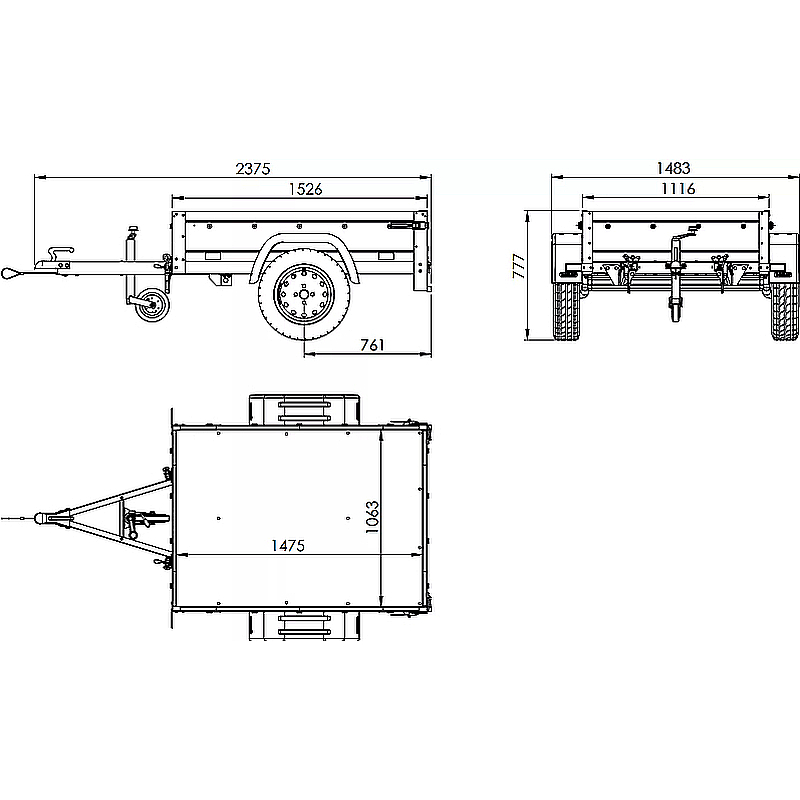 Remolque versátil con dimensiones de 1475 mm x 1063 mm, peso total de 750 kg y capacidad de carga de 750 kg. Ideal para mudanzas y transporte de materiales. Incluye bordes adicionales y lona plana.