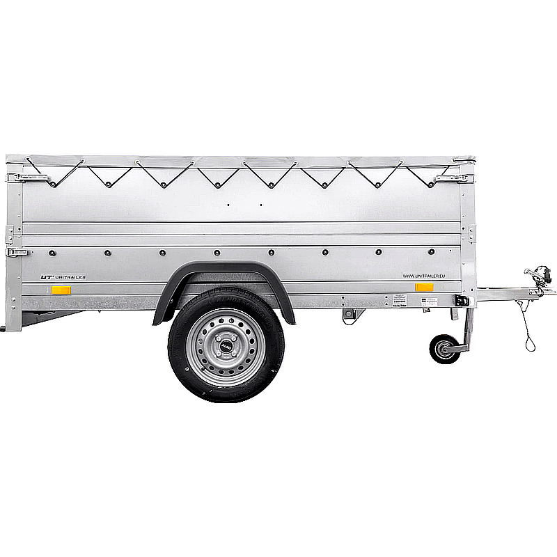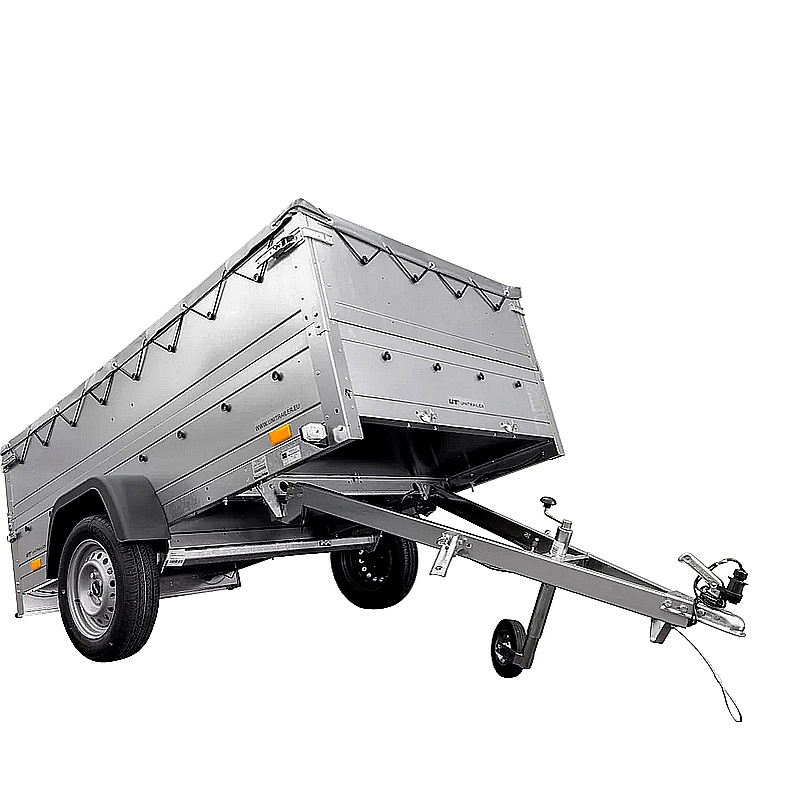 Remolque versátil de 2304 x 1256 mm, con un peso total de 750 kg, ideal para mudanzas y transporte de jardín. Ligero y fácil de cargar gracias a su diseño plegable.