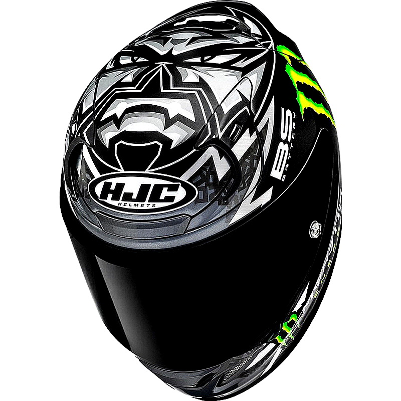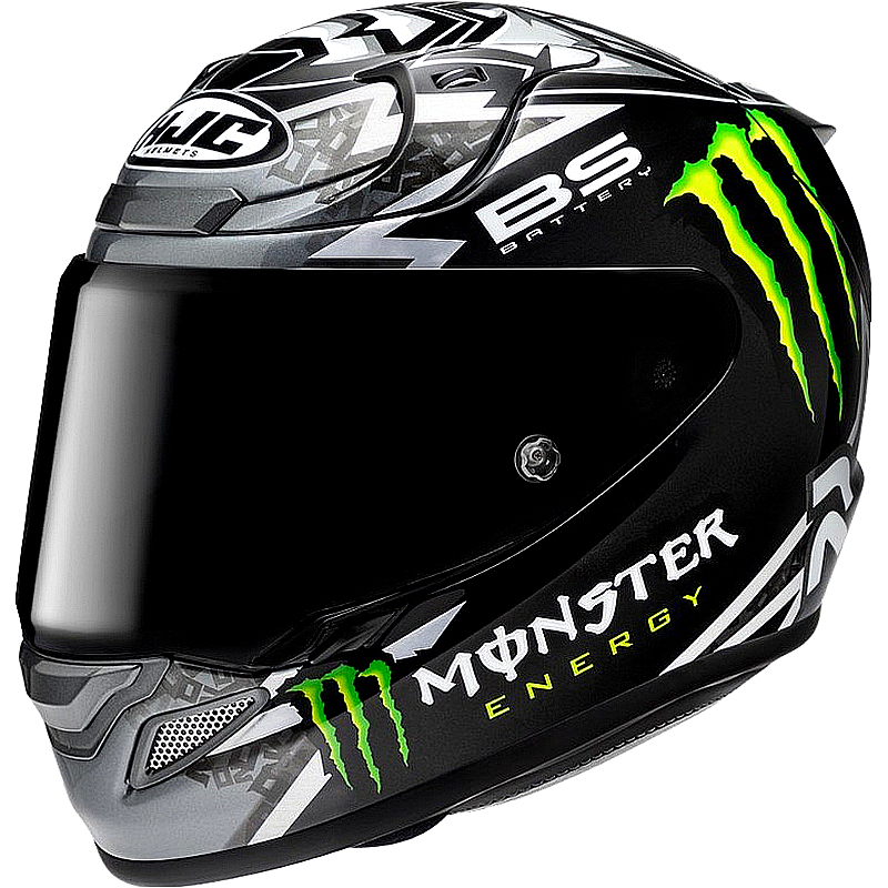 El casco presenta una superficie negra brillante con llamativos acentos plateados y logotipos de Monster Energy, destacando su forma aerodinámica y un amplio campo de visión. Es la elección ideal para los conductores deportivos y seguidores del famoso piloto de MotoGP.