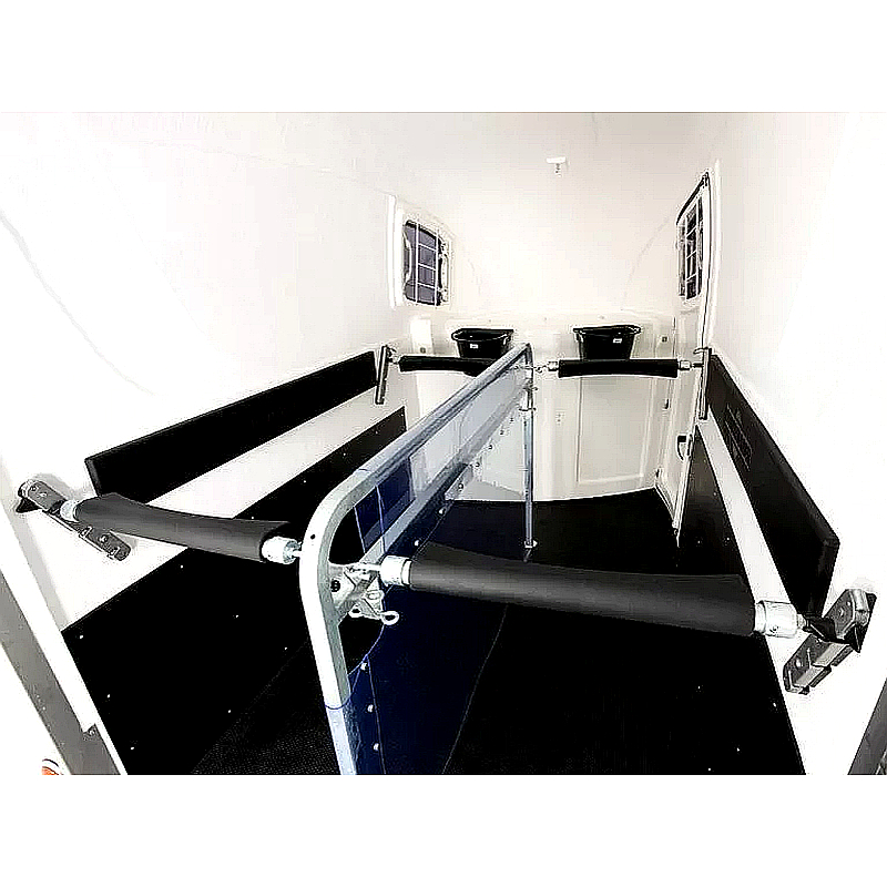 El remolque de caballos Humbaur Maximus 2700 S está diseñado para ofrecer seguridad y confort en el transporte de dos caballos grandes. Su diseño aerodinámico reduce la resistencia al aire, disminuye el ruido del viento y optimiza el consumo de combustible.