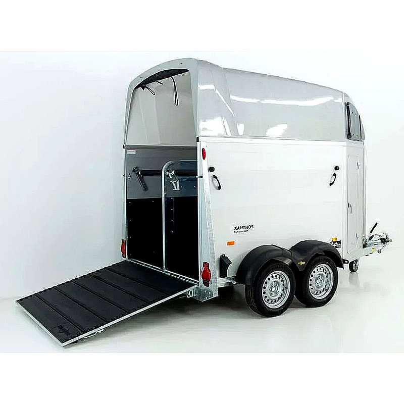 El Humbaur XANTHOS 2000 es un remolque moderno y seguro diseñado para el transporte de dos caballos grandes. Su construcción de aluminio de doble pared y su techo clásico en plata garantizan durabilidad y estilo. El chasis de perfil galvanizado en caliente y el suelo de aluminio antideslizante de 21 mm de espesor aseguran una larga vida útil y un fácil mantenimiento.