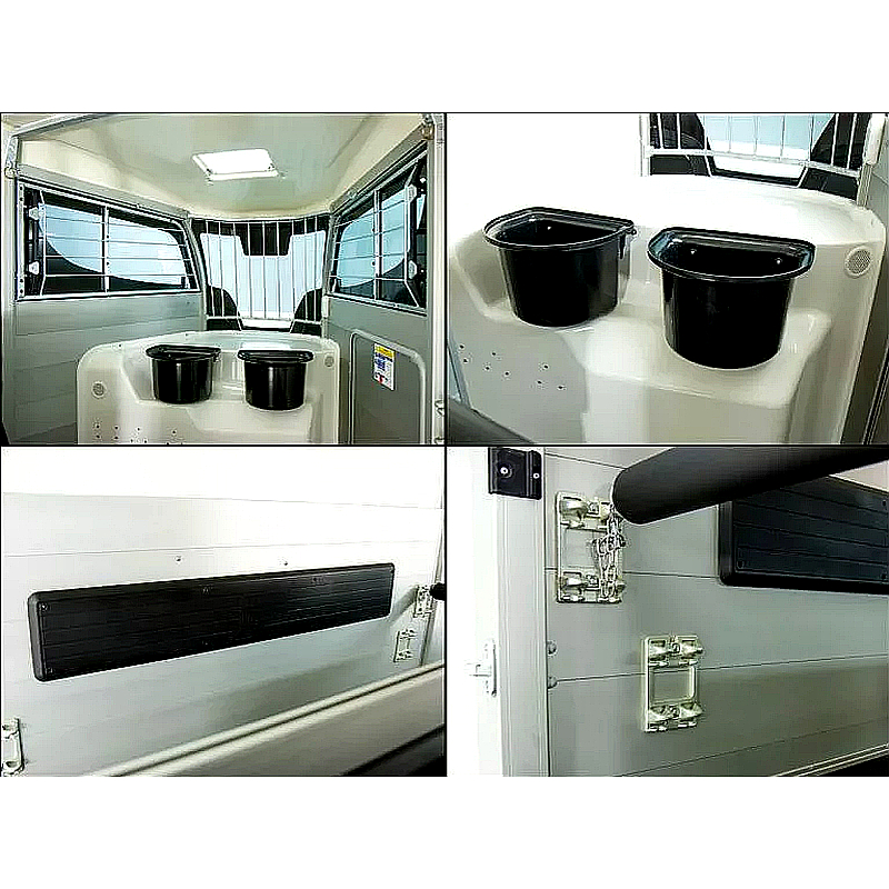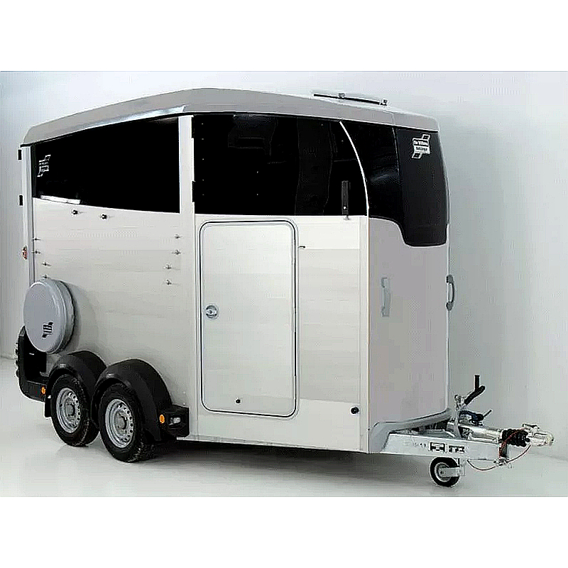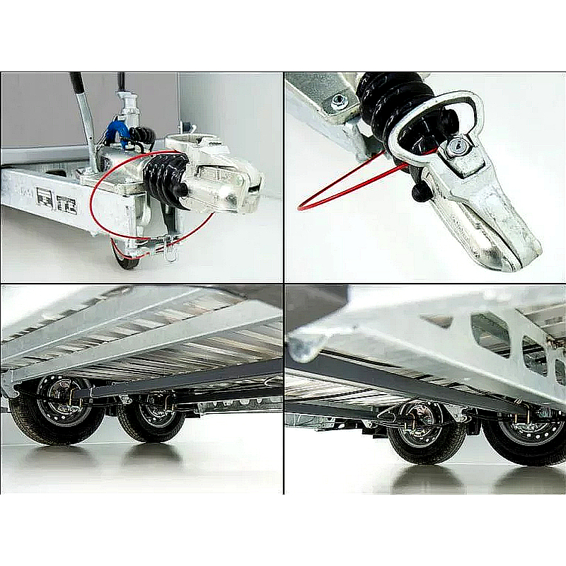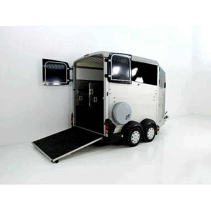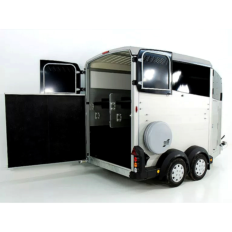 El remolque cuenta con una rampa trasera variable que puede utilizarse como puerta o rampa, paredes de aluminio con protección plástica en ambos lados, y una puerta de entrada con cerradura. La iluminación LED interior y la escotilla de techo ajustable garantizan una ventilación óptima. La pared divisoria central es ajustable y desmontable, y las puertas superiores delanteras se pueden abrir por ambos lados.