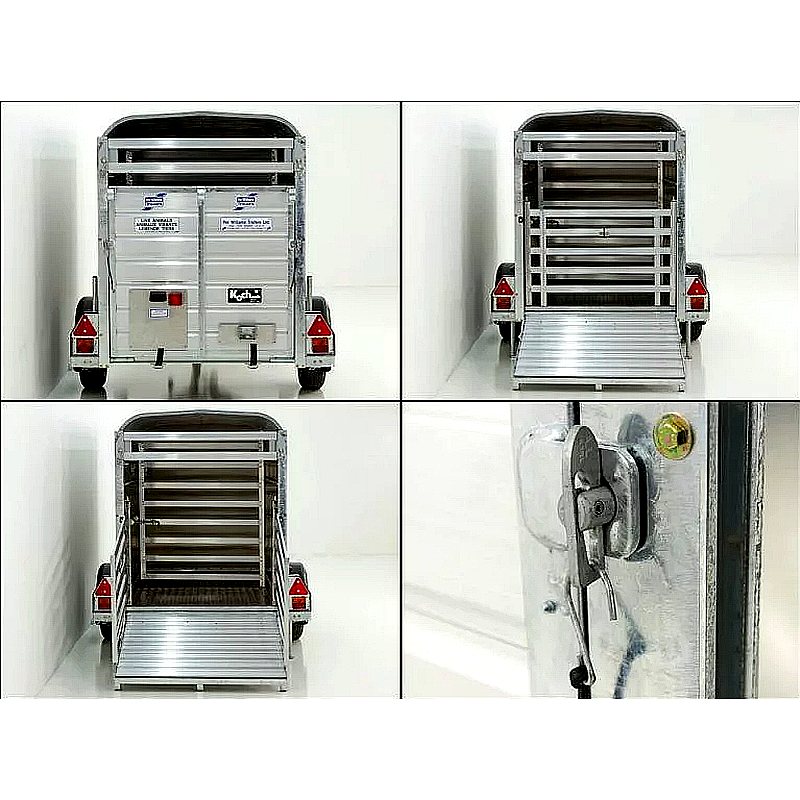El remolque Ifor Williams Schaf- und Kälberanhänger P8G es una opción versátil y robusta, diseñado específicamente para el transporte seguro de ovejas, terneros y cabras. Este remolque ofrece condiciones óptimas para el traslado cómodo y seguro de animales, gracias a su construcción de alta calidad en aluminio y un chasis de acero galvanizado en caliente, que garantizan durabilidad y estabilidad.