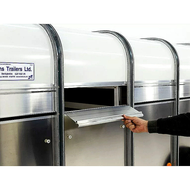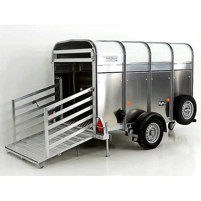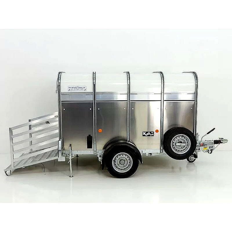 El Ifor Williams P8G es un robusto remolque de aluminio diseñado para el transporte seguro de ovejas, terneros y cabras. Dimensiones interiores: 124 x 244 x 153 cm, peso total: 1,400 kg, carga útil: 940 kg. Es ideal para un transporte seguro y cómodo de animales.