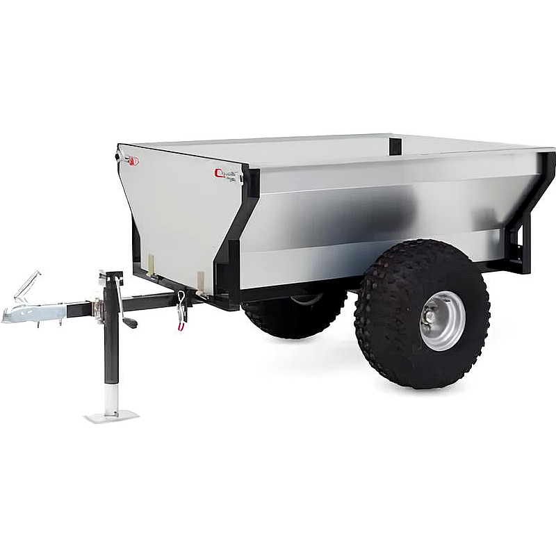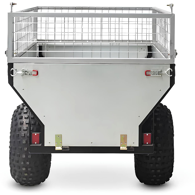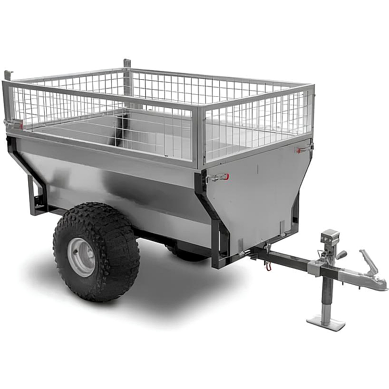 El remolque incluye una caja basculante manual que facilita el vaciado sin necesidad de desmontarlo del vehículo. Las extensiones laterales de acero galvanizado son desmontables, lo que permite una carga y descarga sencilla de materiales como ramas, tierra o escombros.