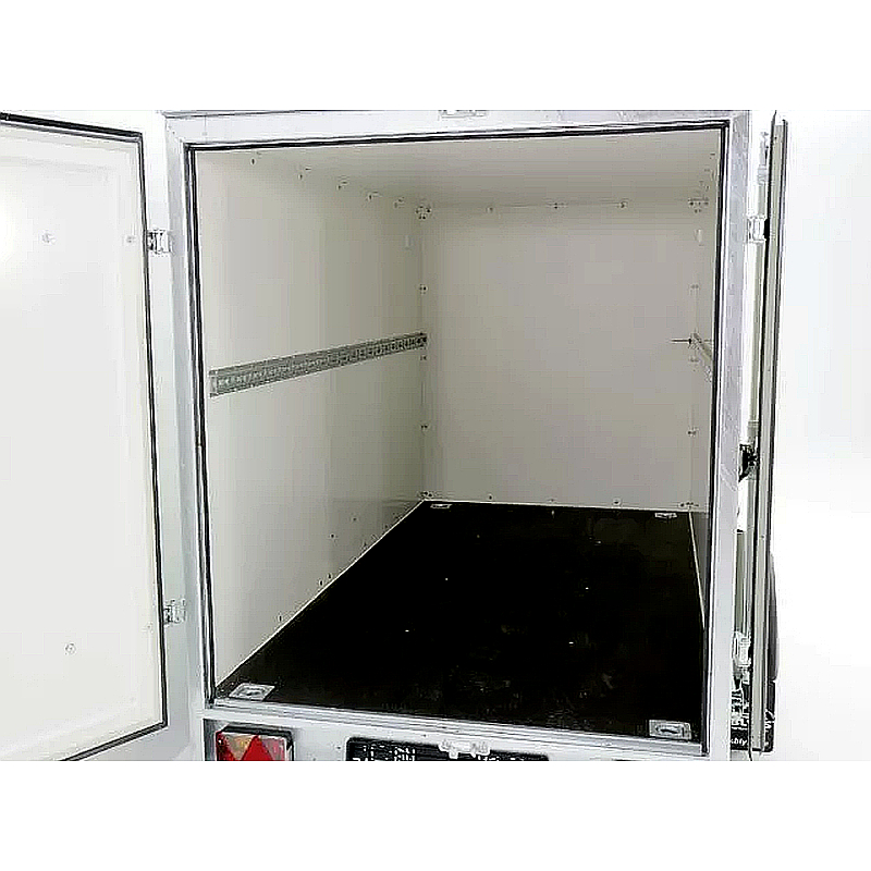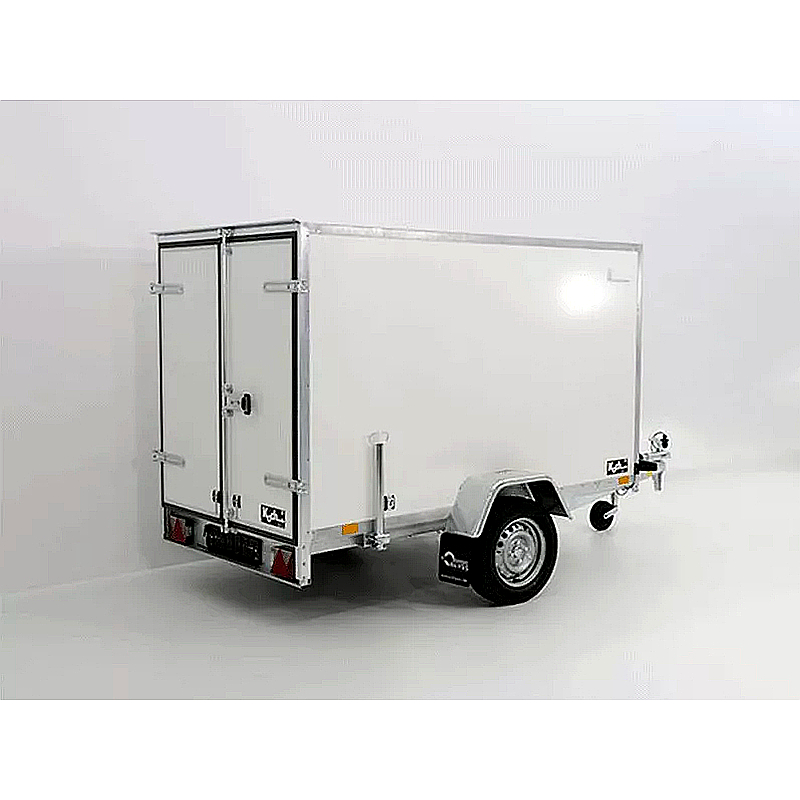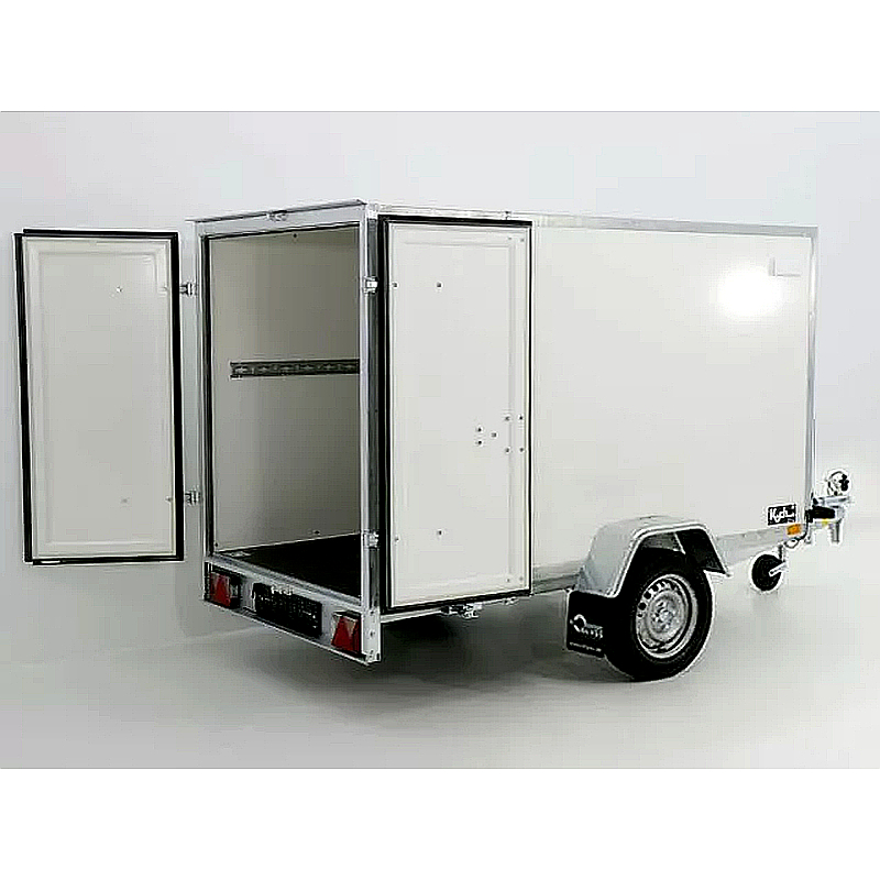 Características y opciones: Incluye rueda de apoyo y soportes traseros ya montados. Ofrece un amplio espacio de almacenamiento, alta seguridad gracias a las puertas bloqueables y flexibilidad en la sujeción de la carga. Al ser un modelo sin frenos, no se requiere una licencia adicional.
