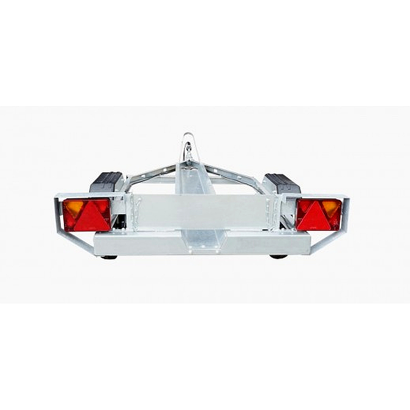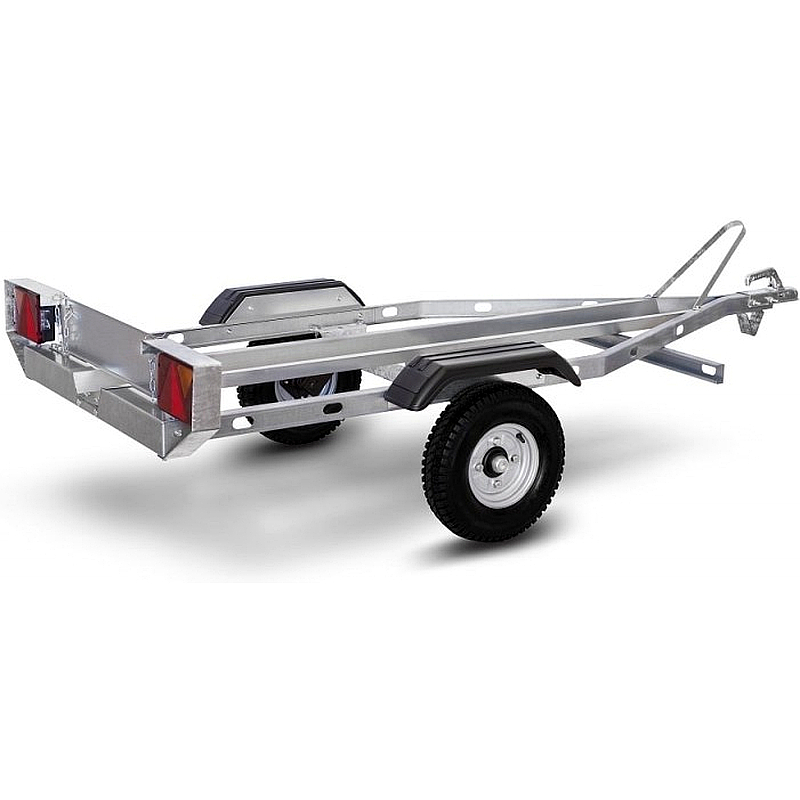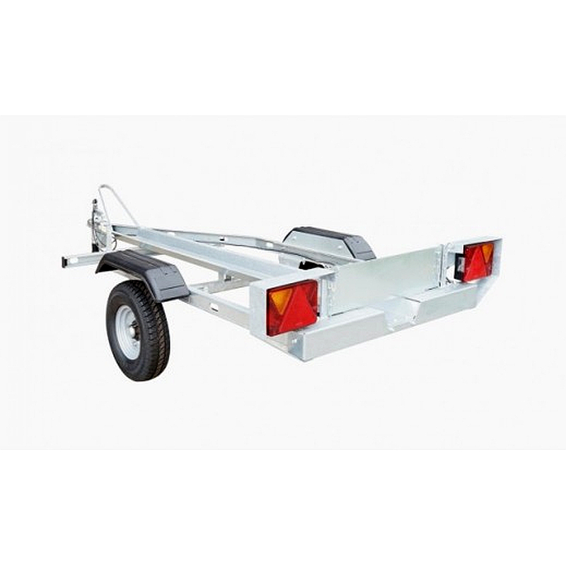 Remolque ligero y funcional para una moto, fabricado en acero galvanizado. Dimensiones totales de 255 x 120 cm, peso en vacío de 57 kg y capacidad de carga útil de 193 kg. Ideal para scooters y motos medianas, homologado a nivel europeo.