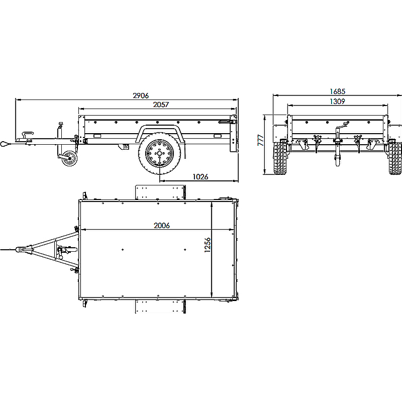 Remolque PKW Garden Trailer 201 KIPP con dimensiones de 2006 mm x 1256 mm, peso total de 750 kg y capacidad de carga de hasta 750 kg. Ideal para mudanzas, transporte interno o trabajos de jardinería.