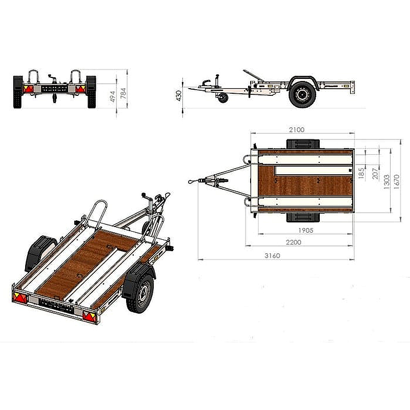 Remolque ligero y resistente para transportar hasta 2 motos. Dimensiones: 3160 x 1670 x 784 mm, peso máximo de 750 kg, ideal para moteros que buscan seguridad y practicidad.