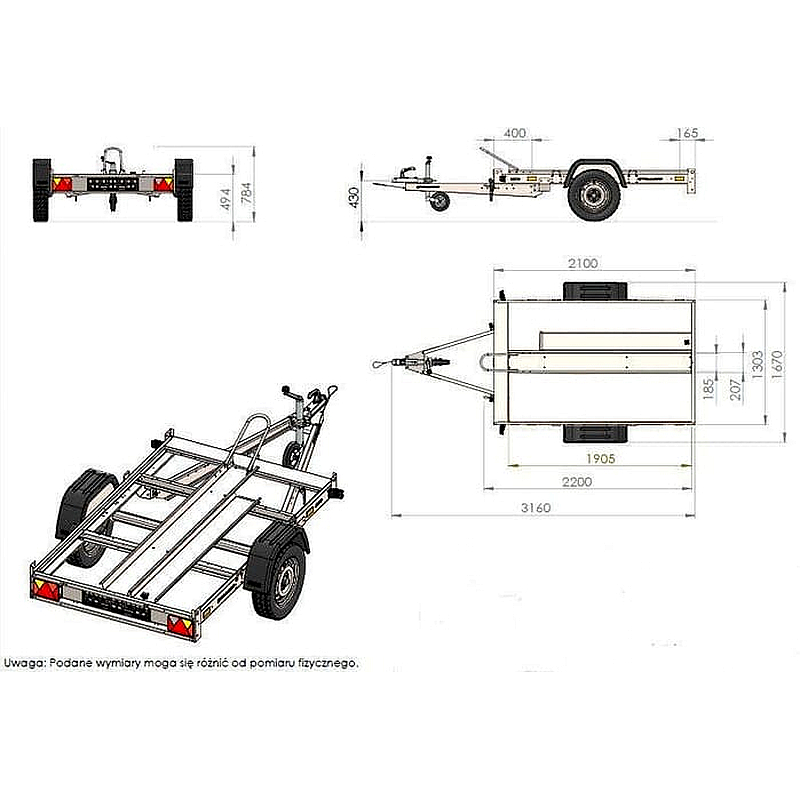 - Dimensiones del remolque: Longitud total: 2000 mm, Ancho total: 935 mm, Altura total: 785 mm