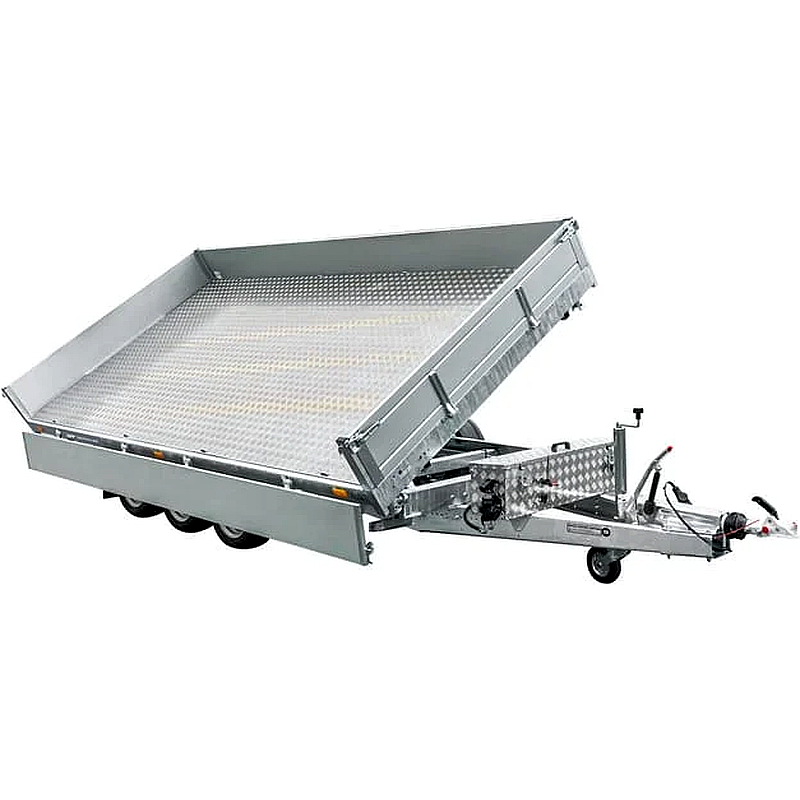 El remolque hidráulico de 3 ejes TASKER 400/3C de Unitrailer es una solución ideal para aplicaciones en construcción, agricultura y servicios municipales. Diseñado para el transporte de materiales pesados, su sistema de volquete hidráulico eléctrico facilita la descarga rápida y segura.