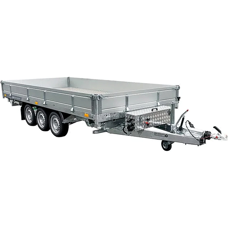 Este remolque destaca por su estructura resistente y su diseño optimizado, que garantizan una distribución uniforme de la carga y una gran estabilidad, incluso en terrenos exigentes. Está pensado para profesionales que buscan un equipo fiable y de alto rendimiento. Su diseño robusto y el sistema de volquete eléctrico aumentan la productividad y reducen el esfuerzo en cada operación.